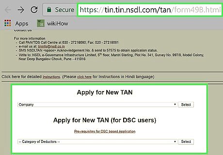 Apply for a Tax Deduction Account Number (TAN). You must have a TAN to deduct income tax from your employees' paychecks. Use Form 49B to apply. You can complete the form online, or you can print it and mail in a paper form. If you want to apply online, visit https://tin.tin.nsdl.com/tan/form49B.html to start your application. You can download the paper application at https://www.incometaxindia.gov.in/forms/income-tax%20rules/103120000000007919.pdf. The processing fee for your application is Rs. 65.00 as of 2018. You can pay using demand draft, check, credit or debit card, or net banking. If you pay using a credit or debit card, there may be additional fees.