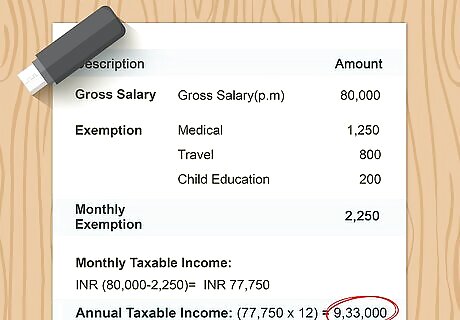 Determine the amount of taxable income. Subtract the total exemptions each employee is claiming from their total income (either monthly or annually) to get the amount of their income that is subject to tax. If you're using a monthly income figure, don't forget to multiply the amount by 12. For example, you pay an employee Rs. 80,000 a month. They claim monthly exemptions of Rs. 1,250 for medical allowance, Rs. 800 for travel allowance, and Rs. 200 for child education allowance, for a total monthly exemption of Rs. 2,250. Their monthly taxable income is Rs. 77,750. Multiply this number by 12 to find an annual taxable income of Rs. 9,33,000.