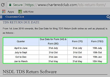 Deliver quarterly statements electronically. Financial-year quarters end on June 30, September 30, December 31, and March 31. Your TDS statement for the quarter is due on the 15th of the month following the end of the quarter, with one exception. The quarterly statement for the quarter ending March 31 is not due until May 15. If you don't file your statement by the due date, you may be charged a penalty. Some small businesses may be able to send in paper statements. However, most employers are required to send electronic statements. The total statements consist of a report form plus your accounting files showing all deductions made for each employee during that quarter. If you upload your TDS files electronically, you'll pay an upload fee of at least Rs. 25 (as of 2018), depending on the number of employees you have. You can also send in a physical copy of your files free of charge. The entire return must fit on one CD.