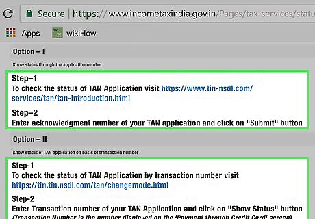 Receive your TAN in the mail. Your TAN will be allotted by the Income Tax Department and sent to the address you listed on your application. Expect this to take several weeks. You can check the status of your application online. To check the status of your application, go to https://www.incometaxindia.gov.in/Pages/tax-services/status-of-tan.aspx. You will need either your acknowledgement number or your transaction number to track your application.