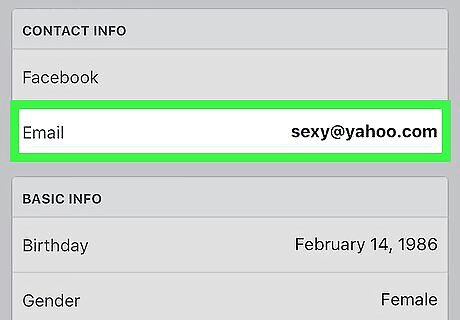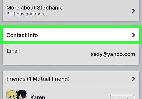 Go to your contact's profile page. You can tap on a contact's name on your News Feed to open their profile, or use the Search bar at the top of your screen to quickly find a person. You don't have to be friends with a person to see their email address. If they've made their email address public, you will see it without having to add them as a friend.