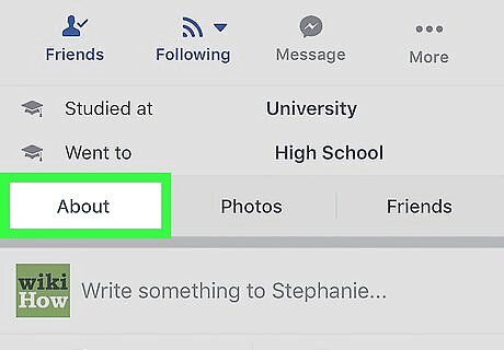 Scroll down and tap About. It's located next to the Photos button below this person's profile picture, information, and Intro text.
