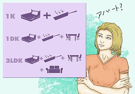 Understand terminology. Many Japanese housing sites will use shorthand lingo to describe types of places. Here are some key terms to know: 1K is a one room apartment with a kitchen. 1DK is a one room apartment with dining room and kitchen. 2LDK is a two room apartment with a living room, dining room and kitchen.
