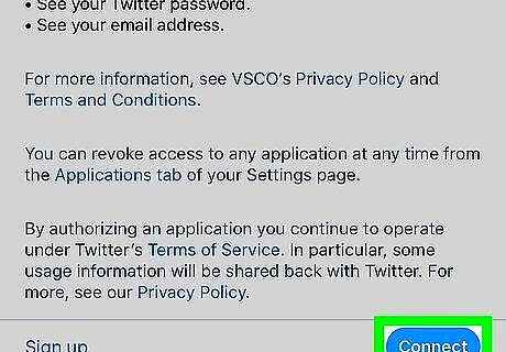 Tap Connect. This is a blue button in the lower-right corner. It will authorize the connection, and link your VSCO account to your Twitter. This will redirect you to the VSCO app, and list all your Twitter friends that have a VSCO account.
