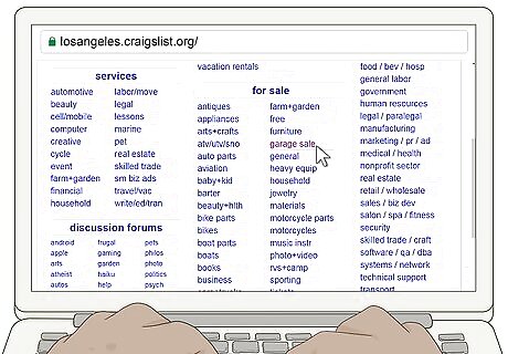Browse Craigslist for more sale postings. To find posted sales, go to the main Craigslist homepage for your geographic area. Look under the “For Sale” tab and click the “Garage Sale” option to find nearby sales that people have posted. The added bonus here is that you don’t need to make a Craigslist account to use the search feature. Make sure you're on the correct Craigslist page for your area. Otherwise, you'll get information far away from your search area. You might also find thrift stores advertising under the garage sale category. This could help you locate more deals on cheap items.
