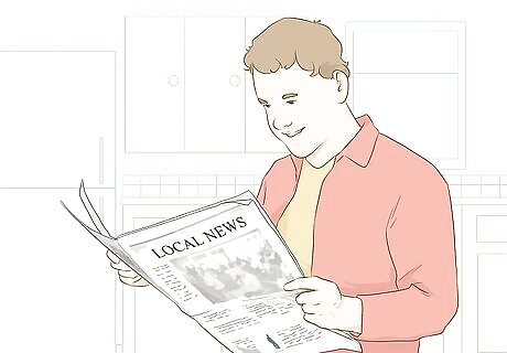 Check for ads in your town newspaper. Flip to the classified or ads section in your local paper. Look for small ads advertising their garage sale. Subscribe to your local paper and check it regularly for sale postings. Subscribing to your local paper is also a great way to support local journalism. You can benefit by finding garage sales and the paper benefits with increased business. Some local papers also post their classified ads on their websites, so check here as well. This option is best for smaller, local newspapers. State or national papers wouldn’t carry information about local areas.