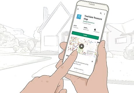 Download an app that collects garage sale data from your area. Search the app store for apps that collect yard sale postings and make it easy for you to find them. Type in the town or zip code that you’re looking near, or let the app use your location to find nearby garage sale postings. One popular app like this is Yard Sale Treasure Map. Try using more than one app to maximize your chances of finding all the garage sales in the area. Some apps only show sales that are advertised on their platform, while others aggregate all the available garage sale data online. Neither show sales that are advertised offline.