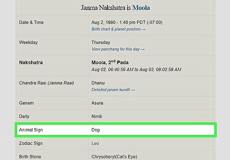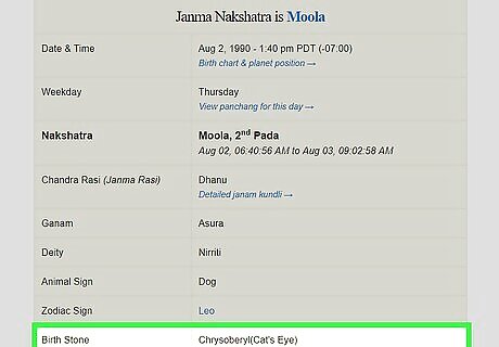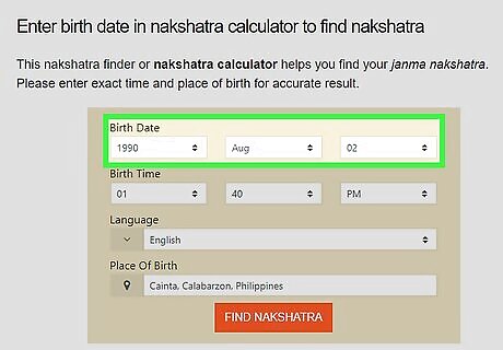 Enter your full date of birth into the calculator. Type in the day, month, and year that you were born in the corresponding slots in the birth date column. If the calculator you’re using has a drop-down list, scroll through the list and tap or click the appropriate date components. The order of the day and month may differ depending on where you live, so look closely to confirm that both pieces of information are in the right slots. Each of the 27 nakshatras corresponds to a particular phase of the moon, as well as its position in orbit. They are said to influence the character, temperament, and fortunes of the person born under them.