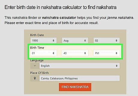 Enter or select your birth location. Type in the name of the country, state or territory, and city, town, or village where you were born. For calculators with drop-down lists, tap or click the birthplace column and choose your place of origin from the listed options. Keep in mind that not all nakshatra calculators with drop-down lists may have an option for your exact birthplace. If you don’t see it, try looking for a different calculator that will allow you to input your information manually.