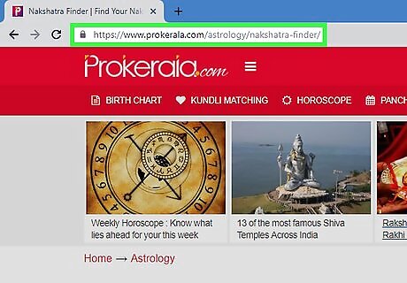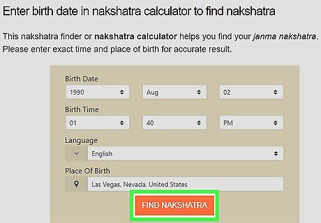 Pull up a nakshatra calculator online. There are many different nakshatra calculators on the Internet, but each of them work the same way. You put in the information relating to the time and place of your birth and the calculator tells you which nakshatra you were born under. The astrology sections of websites like Astroica, Prokerala, and AstroSage all contain free, easy-to-use nakshatra calculators that will give you the information you’re looking for. There are also nakshatra finder apps available for download on the iOS and Google Play app stores.