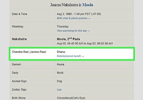Find out your rasi, or Vedic zodiac sign. Each nakshatra has its own corresponding rasi, which is similar to a moon sign in Western astrology. Like your nakshatra, your rasi can tell you about your natural tendencies and behaviors to paint a more complete picture of your life and your relationship to the world. You can use your nakshatra and rasi to consult your horoscope, complete your birth chart, or make use of other astrological resources. Some nakshatra calculators give the traditional Sanskrit names for rasi, while others give their more common Western analogues. Vrishabha, for example, is the Vedic equivalent of Taurus.