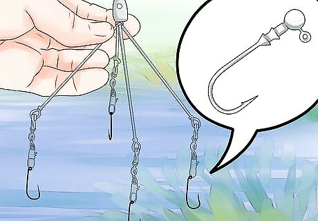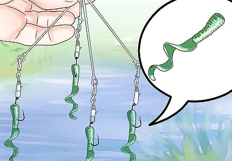 Tip each jig head with a twist-tail grub or worm. Grubs or worms from 4 to 6 inches (10 to 15 cm) in length with a ribbon or sickle tail will flutter when retrieved, creating the illusion of swimming baitfish. The tail should be placed so that it curves downward. Where possible, choose colors that match the food fish where you fish. If that's not possible, you can fall back on the “bright day, bright color; dark day, dark color” rule. If the water is particularly dark, you may want to substitute a spinnerbait for the center jig/grub combination.