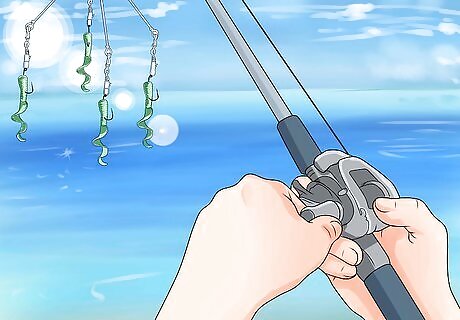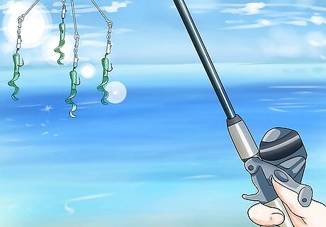 Retrieve the umbrella rig with an interrupted steady retrieve. Reel the rig in slowly for 10 to 15 seconds, then pause for a second before resuming the retrieve. Fish will often strike one or more of the lures when they briefly change direction. You may also get strikes when the rig starts to rise at the moment you're finishing your retrieve. If the speed of your retrieve doesn't work, try increasing or decreasing it.