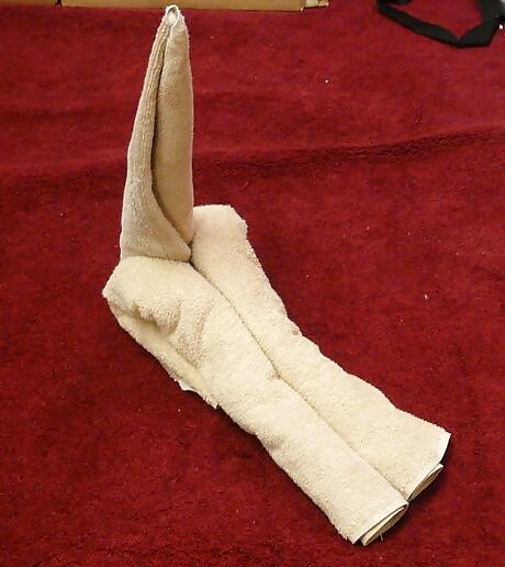 Roll the left and right sides of the towel inwards so that they meet in the middle. Each side of the head should now have a triangular ear jutting out.