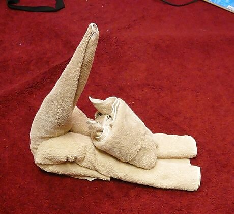 Split the folded end of the “body” towel apart slightly and tuck the cone into the split wide-end-down. Your tail should now look like it’s emerging from the kitty's rump.