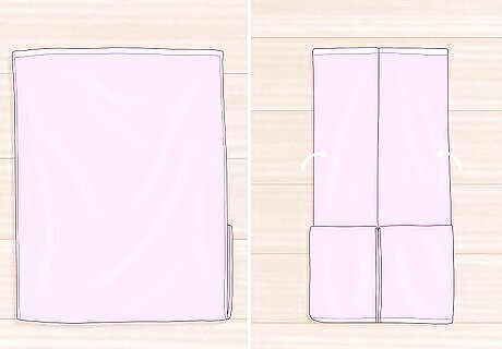 Fold a bath towel into thirds or quarters. It is best to fold bath towels as little as possible, so that they can properly dry (this will reduce the mold smell). If bath towels will be lain flat, such as on a shelf, they are usually folded into quarters, to preserve space. If they are going to be hung, they should generally be folded in half or into thirds.
