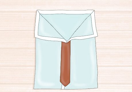 Tuck the tie. Tuck the tie into the shirt collar and place the whole thing on a bed, dresser, or other flat surface to display.