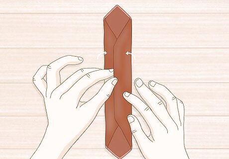 Make the tie. Place washcloth on a flat surface diagonally, so that it makes a diamond shape. Then, fold the left and right corners in to the center and tuck the tips, so that a sort of burrito shape is formed. Tuck down the top corner and flip the whole thing over.Fold Towels Step 13Bullet1 Version 2.jpg You should now have something that looks somewhat like a tie.Fold Towels Step 13Bullet2 Version 2.jpg