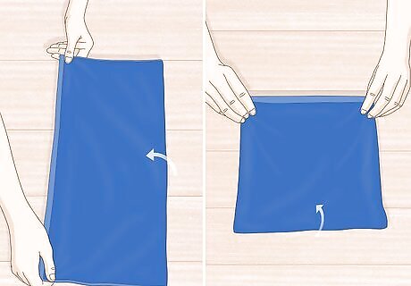 Fold the hand towel into sections. Lay the hand towel out on a flat surface with a vertical orientation. Then, fold the bottom, short edge up about 2/3 of the way.Fold Towels Step 6Bullet1 Version 2.jpg Next, fold that same edge back down until it meets with the folded, bottom edge. Fold Towels Step 6Bullet2 Version 2.jpg