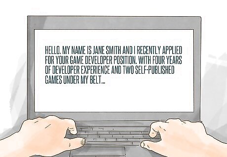 Keep your email brief. The body of your email should accomplish three main goals: introduce you, establish your interest and qualifications, and end with a question that invites a response. Each goal should be done in one or two sentences. Keep the body of your email short and friendly. Avoid summarizing your entire resume or copying your cover letter. The hiring manager already has access to these materials. Your email may say something like, "Hello. My name is Jane Smith and I recently applied for your game developer position. With four years of developer experience and two self-published games under my belt, I believe I could be a real asset to your team. Is there a good time for me to meet with you and your team about this opportunity?" You can say that you're checking in on the status of your application and are happy to answer any questions that they may have. This shows you're on top of things and organized, excellent traits for prospective employees.