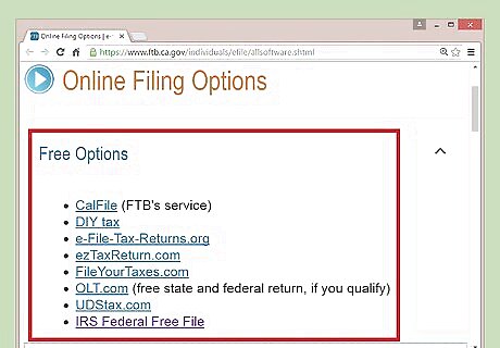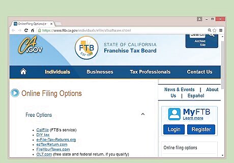 Visit California's Franchise Tax Board website. All California tax returns are handled by the California Franchise Tax Board (FTB). The FTB website offers a number of free options for filing your state income tax return. Visit the FTB website and click on the link that says "Other Free Options." A number of free options will pop up on your screen. To get started, visit the FTB website at https://www.ftb.ca.gov/individuals/efile/allsoftware.shtml.