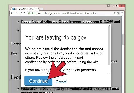 Choose the option that fits your needs. Once you know the eligibility requirements and hidden costs associated with each service, you will be ready to choose the service that will work for you. To choose an option, click on the link provided on the FTB website, then click the button provided to use the service. Once you click on that button, you will receive a disclaimer stating that you are leaving the FTB website and are going to a private site. Click "Continue" to go to the service's website.
