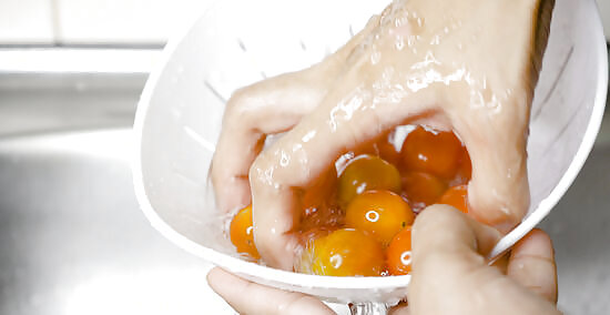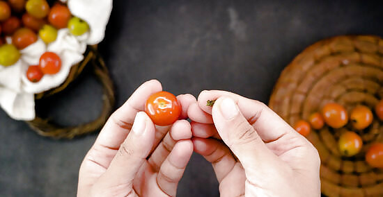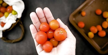 Remove the stems from your tomatoes. Once you’ve sorted your tomatoes and found a few prime specimens for freezing, inspect them carefully for remnants of stems. When you find them, pinch them between your thumb and forefinger and twist them off, being careful not to damage the tomato in the process. While you’re at it, brush off any large pieces of debris, like leaf scraps or clods of dirt, by hand. Don’t try to cut the stems off of your cherry tomatoes. Doing so is likely to rupture their skins, letting out all of that flavorful juice.