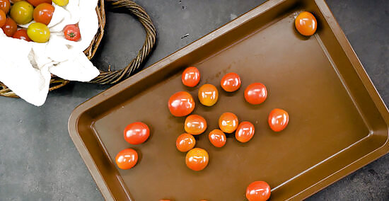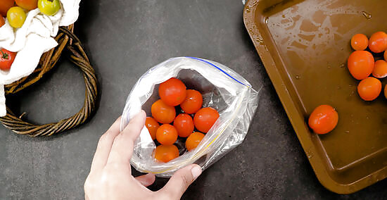 Pop your tomatoes in the freezer for 1-2 hours. Find a spacious area for the baking sheet and make sure it’s lying as flat as possible. You’ll know your tomatoes have successfully completed their first round of freezing when they harden into delicious little globes. There’s no need to set a timer or keep too close an eye on your tomatoes' progress. Just give them a squeeze after the first hour. If they still feel squishy, let them cool out for another half hour or so, or until they’re firm to the touch. The purpose of this preliminary freeze is just to make them less likely to stick once they’re placed in a smaller container together.
