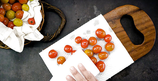 Dry the tomatoes with a paper towel, or allow them to air dry. Transfer your squeaky-clean tomatoes to a layer of folded paper towels and use another towel to gently pat them dry. Alternatively, you can simply dump them out and wait for them to dry naturally. It’s important to make sure that there’s no standing water on your tomatoes once you’re actually ready to freeze them. Excess moisture will become frost, and frost can lead to clumping or even spoil your tomatoes prematurely.