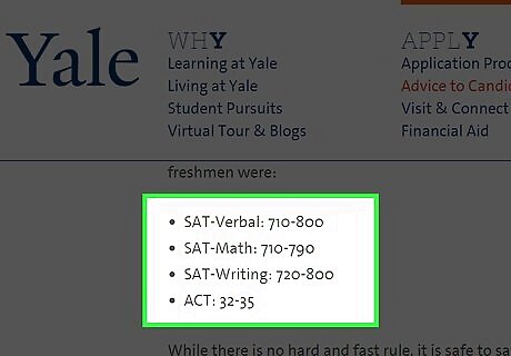 Figure out what standardized tests scores the schools you’re interested in want to see. Every school in the U.S., including the Ivy Leagues, will accept either the SAT or the ACT as of 2007. Though most people submit SATs to top colleges instead of ACTs, admissions experts say that there is no compelling evidence that schools favor one test over the other. Most top colleges have a minimum test score that they deem acceptable for admittees (plural form of admittee), so check out what that score is. This information will be on the website of the school you’re interested in.