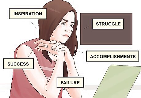 Brainstorm. Your first idea is probably not going to be the one that you stick with. Start a brainstorming list, outline, concept map, or whatever works for you as soon as you read the prompt. Sleep on it and return to it every day for a few days until you decide what your prompt will be. Consider: What people, dilemmas, animals, books, places, trips, or experiences have had an impact on your life? Can you think of a time when someone or something challenged your thinking? A time when you struggled? A time when you triumphed? It’s okay if you pick a topic that seems quite basic -- as long as you care about it and can write passionately about it. What are your major accomplishments? What events led up to these accomplishments, and what makes you feel proud about them? (Think beyond school-related accomplishments. Surviving your parents’ divorce or the death of your dog might be an accomplishment that you’re proud of in hindsight, so if you can write about why that was important to you, go for it.) When you think of the topic, be sure that you also brainstorm about its effect on your life. For example, anyone can write about working for Habitat for Humanity. What will be interesting and compelling is the story of what working for Habitat meant to you or how it changed your views on the world.
