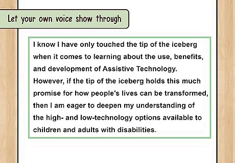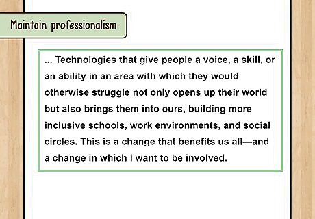 Maintain professionalism. Don’t fall into the trap of trying so hard to stand out that you use lots of slang or colloquialisms. Don’t do anything gimmicky like writing the whole essay as a sonnet. It’s okay to share your opinions, but avoid anything super controversial. More than one person will read your essay, and there is no way of knowing who that person will be, so you must appeal to a wide audience.