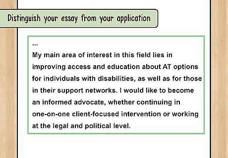 Distinguish your essay from your application. Don’t write about how much you love softball if almost all of your application is about your four years on the team, your time as captain, and your all-district medals. Don’t mention your GPA or standardized test scores.