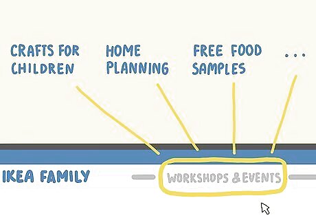 Participate in workshops and events through your card. Every IKEA store offers free events for IKEA Family members. Some examples include crafts for children, home planning, and free food samples. View event listings on IKEA websites, then click on interesting events to register for them if required. To view events, go to https://events.ikea.com/us/en/events/. To register for an event, log into your IKEA Family account. If you aren’t already logged in, you will be asked to log in or join when you click the registration button. Most events are free, including the ones you have to register for. However, be sure to read the event details closely in case you have to purchase a ticket.