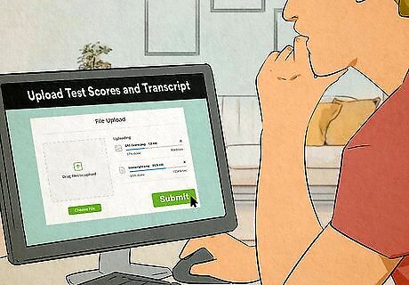 Submit your standardized test scores and transcripts. Almost all higher education institutions require a standardized test score, like the SAT, ACT, or TOEFL. When you take the test and get your score, go online to select the colleges where you want to send your scores. Additionally, remember to contact your high school and request that they forward your transcripts to the college. If you haven’t received confirmation that the school received your scores or grades, call the admissions office to confirm with them. If they haven’t, go online and send the test scores again, or visit your guidance counselor for help with forwarding your transcripts.
