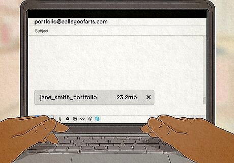 Send your portfolio along with the rest of your application. Once you’ve answered all of the questions on the application and attached all of the required materials, you can submit your online application. Remember to include your portfolio images and supplemental materials, as well. Depending on the school, you may be required to send your portfolio separately to a specific email address. Some more traditional schools might require you to mail your portfolio or present it in person. Be sure to check the school’s website to get the right information.