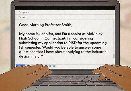 Contact faculty members in your desired department to discuss the school. When you’re researching potential schools, take a look at the faculty list for the department that you’d be applying to. Check to see what the faculty members are researching or creating, and send a quick, polite email to 1-2 of them to discuss the school. For example, you might say something like, “Good Morning Professor Smith, My name is Jennifer, and I’m a senior at McKinley High School in Connecticut. I’m considering submitting my application to RISD for the upcoming fall semester. Would you be able to answer some questions that I have about applying to the industrial design major?”