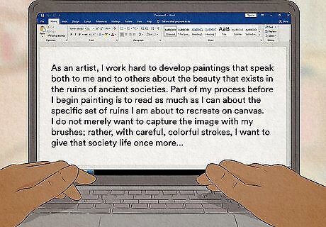 Write a personal statement that focuses on your strengths. Most schools require some type of personal statement or statement of purpose to go along with your art portfolio and application. Be sure to answer all of the questions that they ask, and focus on convincing the admissions panel that you’re the best candidate for the school. If you’re having trouble coming up with a response, talk about how you created some of the works in your portfolio. This will help you to focus on your goals and strengths as an artist, rather than your life story.