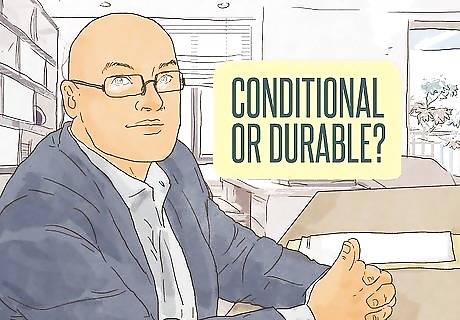 Recognize the varieties of powers of attorney. You may hear “power of attorney” used in a variety of contexts. Each means something slightly different. A “springing” (or “conditional”) power of attorney becomes effective when some condition is met. For example, a springing power of attorney may state that it becomes effective only when you are incapacitated. A “durable” power of attorney, by contrast, becomes effective immediately. Medical power of attorney forms are invariably “springing”—that is, they specify that the agent will begin making decisions when you, “in the opinion of the agent and attending physician, are unable to make or communicate a choice about a particular health care decision.” You can create a “power of attorney” for almost any situation. If you are purchasing a home, you can create a power of attorney which authorizes someone to purchase the home subject to limitations. The other most common form of power of attorney is a “financial power of attorney,” where you give someone the power to make financial decisions for you.