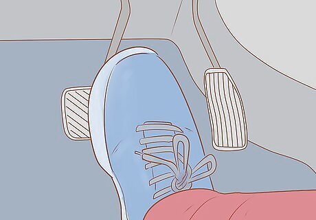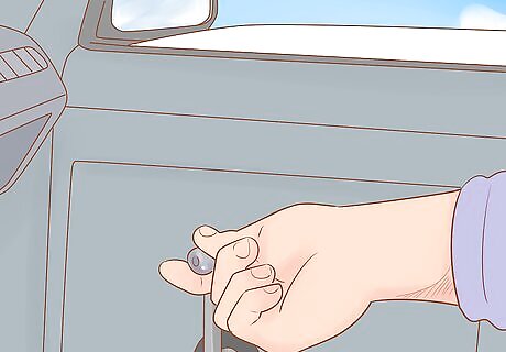 Set the parking brake. Pull the brake handle slowly, stopping if you detect any slight movement. Once you've turned on the parking brake, remove your foot from the brake pedal while again watching for movements. In some cars, the parking brake will only work on the rear wheels. If you notice movement when you lift your foot from the brake pedal, find a large and heavy object to weigh the brake down while you escape. You could, for example, place a large, heavy backpack or antifreeze bottle over the brake pedal if your parking brake only works on rear wheels.