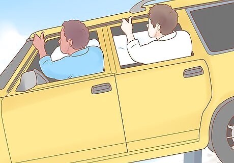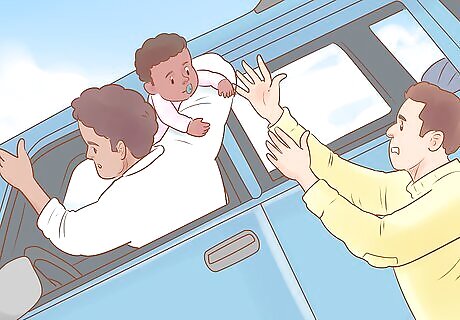 Help young passengers through the exits. If you have any infants or small children in the car, wait until at least one adult passenger has exited the car. Pass them through the window or door to the adult to ensure that they exit safely from the car. If only one adult passenger is in the car, reach out the door or window to place the child on the car or carefully toss them towards a bush or patch of grass away from the cliff. Work slowly while helping small children and infants out of the car to prevent sudden vehicle shifts.