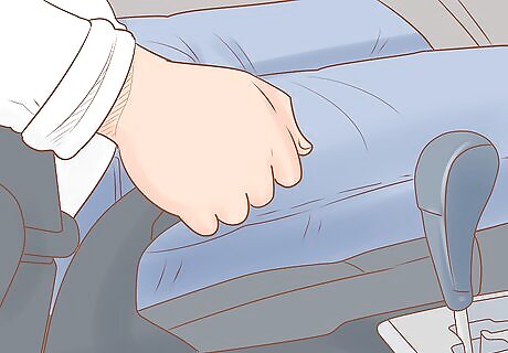 Recline your seat back. Reclining your seat will shift the center of gravity from the car's engine towards the back of the car. Once you've secured the brakes, find your seat's recline button and pull it back to prevent a weight imbalance while you move. This will reduce the chances of the car tipping forward and rolling off of the cliff's edge.