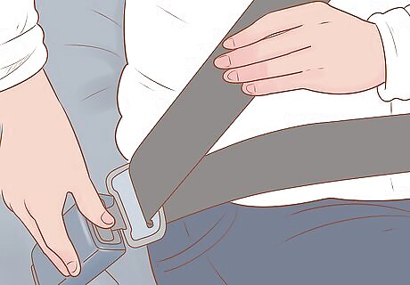 Take off your seat belt. Before you begin to exit the car, unbuckle your seat belts so you can escape easily. If you have any children in the car, help them and any passengers who need assistance unbuckle their seat belts.