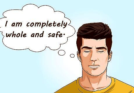Repeat calming affirmations. After you open your eyes, it can help to start reciting a positive mantra that gives you the composure to get up and start your day. You can recite a phrase from memory or post something on your bathroom mirror to repeat mentally or verbally as you brush your teeth, wash your face, and tidy up for the day ahead. Repeat something like: ”I feel calm and at peace with myself.” Anxiety does not control me. I can control it.” I am completely whole and safe.” ”I have gotten through anxiety before, and I can do it again.”