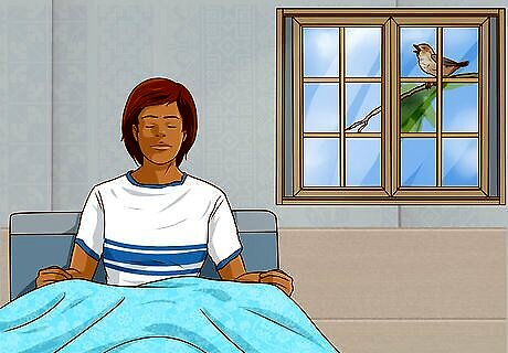 Do a grounding technique to ease panic. If your anxiety is carrying your thoughts away from the present moment into frightening situations that you expect to happen during the day ahead, bring yourself back with a grounding exercise. Grounding helps you relieve anxiety by directing your attention to the here and now. You can stay grounded with any sensation in your bedroom. Take deep breaths as you do the activity. Feel the way the sheets feel on your skin. Notice the tingle. Grip the covers in between your fingers. Hear the sound of the birds chirping outside your window. See the soft morning light. Remember, you are safe.