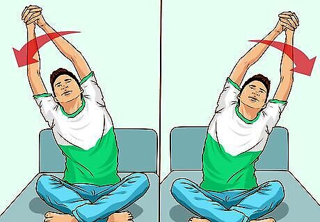 Do stretches. Stretching is a great way to de-stress and loosen up tight muscles after a night of sleep. Performing a few yoga poses while on your bed can get your metabolism going and make you feel more awake, too. Sit up in your bed and clasp your hand high above your head. Lean into the muscles on your left side. Hold for a few seconds. Then, lean to the right. Make invisible circles with your nose, allowing your neck to stretch. Do a spinal stretch by placing one hand on your knee and then turning gently to face the headboard. Repeat on the other side.