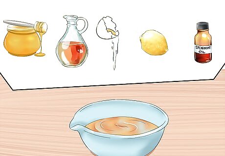 Try an herbal face mask. Facial masks can help clean, tighten, and heal the skin. To use an herbal mask, spread the mixture over your face and neck and allow the mixture to dry for 15 minutes. Then, rinse off the mask with lukewarm water and pat your skin dry. Follow up the treatment with a non-comedogenic moisturizer. You can make a mask for oily skin by mixing: 1 tablespoon of honey 1 egg white 1 teaspoon of lemon juice ½ teaspoon of an essential oil of your choice (peppermint, spearmint, lavender, calendula, or thyme)