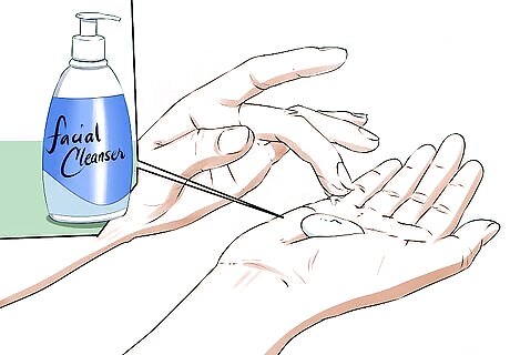 Use your fingertips to apply the cleanser. Gentle cleansing is the best way to clear up acne, so your fingertips are the best tool to wash your face. Don’t use a washcloth or a sponge as this can irritate the skin and cause even more problems. Work the cleanser into your skin using gentle circular motions. Then, use lukewarm water to rinse away the cleanser when you are done. Do not scrub your face! Scrubbing may cause irritation and, in some rare cases, scarring.