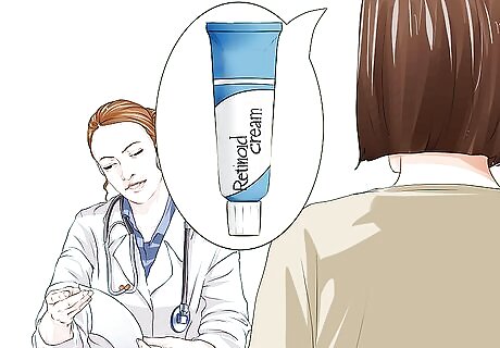 Request a topical retinoid cream or gel prescription for mild acne. If your hormonal acne is mild to moderate, then you may only need to use a topical retinoid treatment. These creams and gels help to remove oil and dirt from pores and prevent future breakouts. Doctors sometimes prescribe an antibiotic along with the retinoid cream or gel to deal with the bacteria that is associated with acne.The dermatologist may also prescribe a product called Dapsone gel or recommend benzoyl peroxide creams, gels, or washes.