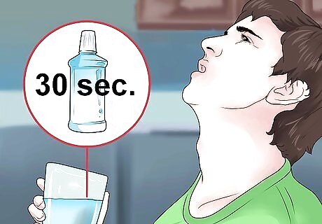 Rinse with mouthwash. Rinse out your mouth and brush your teeth before using mouthwash, if possible. Place a small amount of mouthwash in the cap of your mouthwash bottle. Amounts will vary depending on manufacturer instructions. Don’t dilute the mouthwash unless the instructions tell you do so. Rinse the mouthwash back and forth in your mouth for 30 seconds. Spit it out in the sink and do not swallow the mouthwash.